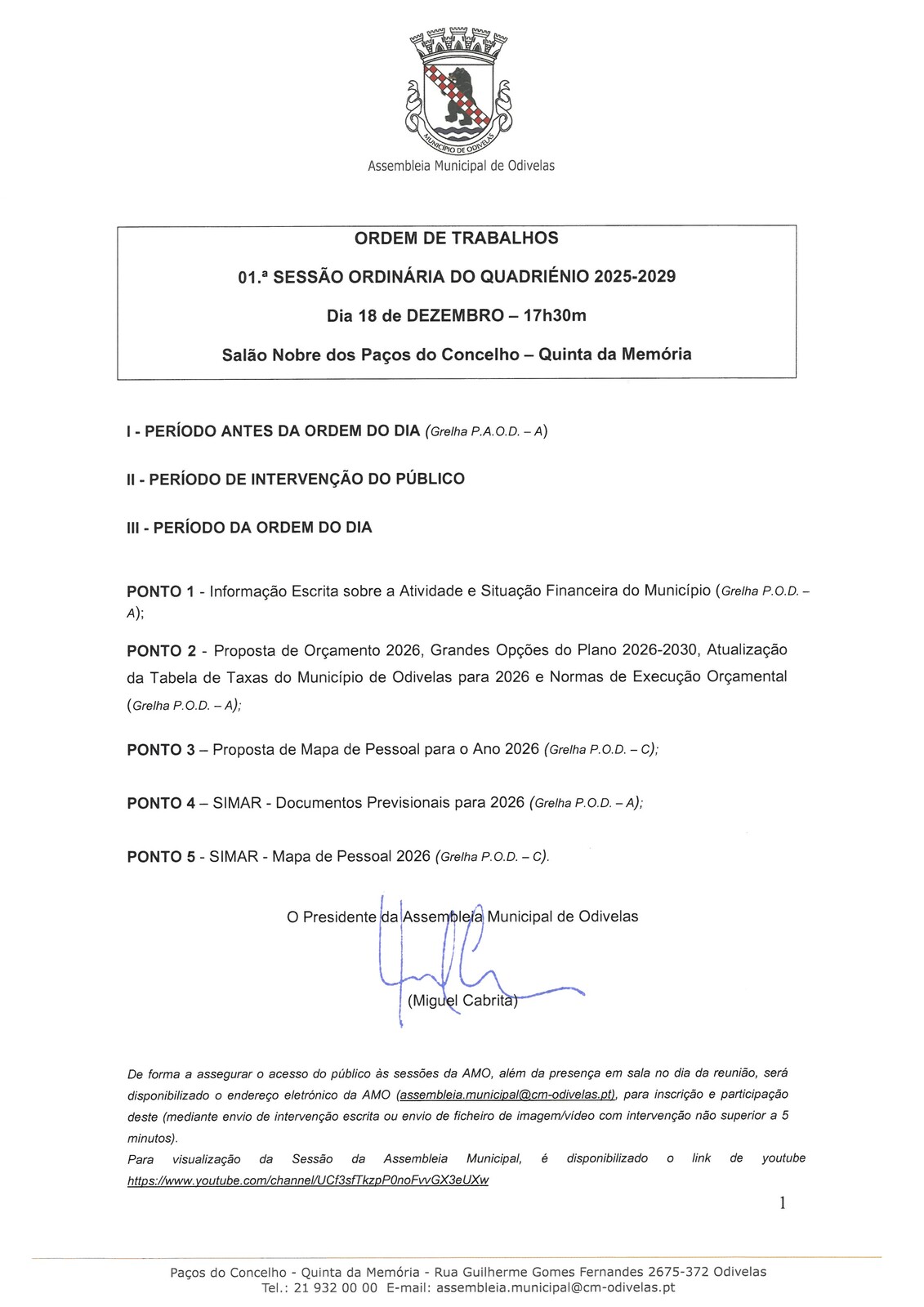 01.ª Sessão Ordinária do Quadriénio 2025-2029
